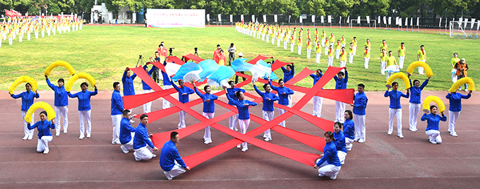 上午8時(shí)許,在雄壯的《運(yùn)動(dòng)員進(jìn)行曲》伴奏下,6名護(hù)旗手組成的國旗方隊(duì)和19支代表隊(duì)方隊(duì)先后接受大會(huì)檢閱,運(yùn)動(dòng)員們步伐整齊、精神抖擻、口號(hào)嘹亮、動(dòng)作新穎,充分展現(xiàn)了城投職工良好的精神風(fēng)貌,給大家留下了深刻印象……隨著公司董事長金國發(fā)宣布本次賽會(huì)開幕,600名職工帶來了新編創(chuàng)作《我和我的祖國》、《咱們工人有力量》大型團(tuán)體操展示,伴隨著激昂的旋律,他們動(dòng)作整齊劃一、協(xié)調(diào)舒展,充分展現(xiàn)了城投職工愛黨愛國愛企業(yè)、團(tuán)結(jié)奮發(fā)的精神面貌。