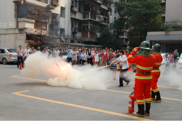 下午4時整,一股濃煙從武漢燃氣大樓六樓蔓延開來,緊促的火災警報聲立即響起。接到火災報警后,現場總指揮有條不紊地展開了部署,立即傳呼物業公司相關人員前往現場查看并檢查相關設備設施,將現場情況報告給監控中心,命令各單位專兼職消防隊員迅速沖進現場進行救援疏散。大樓內的員工用毛巾捂住口鼻,有序地迅速沿疏散路線逃離“火場”,整個疏散過程安全、快速、有序,不到10分鐘,所有人員疏散到集合地點。隨后,物業公司在燃氣大數院內安全集合點進行了一場消防滅火的示范,并由物業公司員工及燃氣大樓內單位的工作人員代表使用滅火器對油桶進行滅火。
