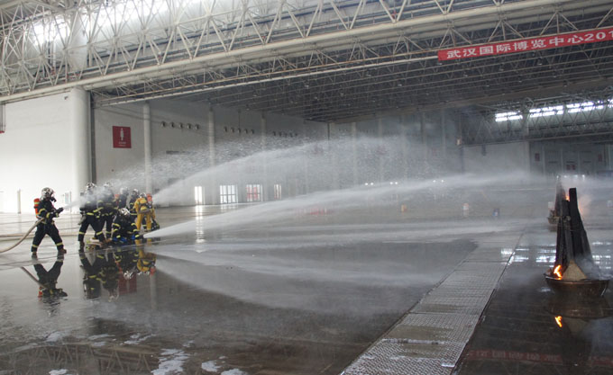 演練模擬展館B1館發生火災,聽到警報聲后,現場安保人員緊急組織參展人員疏散,并撥打119報警。同時,經營公司安全部組織人員利用消防栓進行滅火,控制火情,隨后國博消防站、漢陽區消防大隊墨水湖中隊的武警官兵趕到現場,轉移現場受傷人員,并最終將火災撲滅。