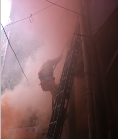 下午2點30分,現場指揮一聲令下,消防疏散演練正式開始。隨著煙霧彈的投放,濃密的黑煙迅速在演練區域房屋內彌漫開,一位居民馬上模擬向“119”報警,兩個單元的住戶在義務消防員帶領下彎著腰,捂住口鼻,按照每層樓的疏散指示圖快速逃離火場,并有序撤離到安全地帶。演練完畢后,李警官向現場人員逐一講解了消防器材的種類、使用方法及滅火注意事項,并現場演示滅火器操作程序、液化石油氣罐如何滅火,高處如何利用身邊的物體逃生等。簡單的培訓講解后,住戶們都積極踴躍地使用滅火器進行了實地滅火演練。