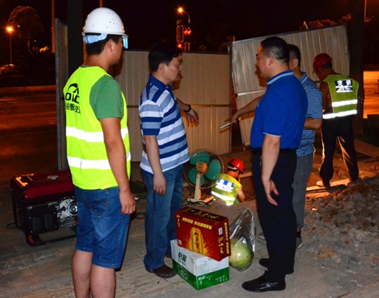 8月1日晚9時,光谷智能公司董事長吳丹帶隊,來到位于青山區工業四路的武漢市智慧交通示范項目施工工地,慰問夜幕下的一線施工人員,為他們送去防暑降溫物品。