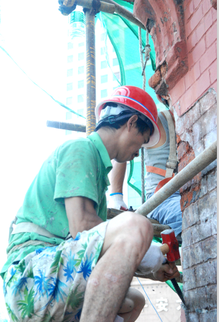 目前,負責(zé)漢口水塔立面保養(yǎng)維護工程施工的是曾被市領(lǐng)導(dǎo)稱為武漢市立面整治工程“鐵軍”的武漢城投房產(chǎn)集團天時建筑工程公司。該公司現(xiàn)場負責(zé)人介紹:整個工程工期40天,7月30日開始搭設(shè)外腳手架,8月5日開始正式施工,9月15日前將完成“水塔文物建筑本體”的立面原狀恢復(fù)及屋面治漏等工作,對其損壞的立面清水磚、毛石砌塊、原有木門窗等進行全面修復(fù),還原其百年前建筑風(fēng)貌。盡管工程時間緊、要求高,但該公司表示將克服困難,科學(xué)調(diào)度,精細施工,還原經(jīng)典,為推進中山大道綜合保護與改造工程,重現(xiàn)老漢口歷史風(fēng)貌再作貢獻。
