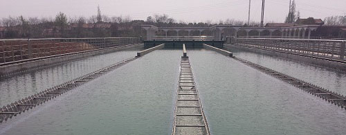 該擴(kuò)建工程凈水水源由現(xiàn)有取水泵房提供,該泵房處于長江干堤內(nèi),采用岸邊下沉濕式井室架空泵房潛水泵井筒取水方式,該泵房土建設(shè)計(jì)取水能力能滿足擴(kuò)建后的供水需求,本次擴(kuò)建對(duì)取水泵房部分潛水泵進(jìn)行了更換及配電控制柜的改造,機(jī)泵控制依舊采用無人值守自動(dòng)控制。輸水管道工程從現(xiàn)有2條DN1200取水管聯(lián)通管道處接入至三期反應(yīng)沉淀池,反應(yīng)池進(jìn)口設(shè)置2臺(tái)格柵機(jī)去除水中較大雜質(zhì),在反應(yīng)池前部設(shè)有預(yù)沉池,用于分離江水泥沙,防止堵塞絮凝反應(yīng)池中的穿孔排泥管。送水泵房采用10KV高壓電機(jī)供電,裝設(shè)560KW水泵機(jī)組3臺(tái),其中變頻控制2臺(tái),軟啟控制一臺(tái)。整個(gè)生產(chǎn)工藝全部采用計(jì)算機(jī)自動(dòng)控制,中控室設(shè)立視頻服務(wù)器及生產(chǎn)監(jiān)控管理上位機(jī)集中監(jiān)控管理控制。