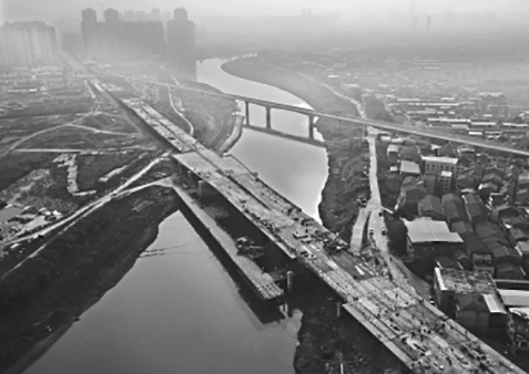 跨朱家河段橋梁全部為鋼箱梁結構,寬34-40米不等,重3100噸,施工時采用步履式頂推設備分5次將鋼箱梁頂推完成,每次頂推距離約30米。預計本月下旬朱家河橋將完成瀝青攤鋪,12月中上旬完成路燈安裝和地面標線劃設等收尾工作,可保證年底通車目標。