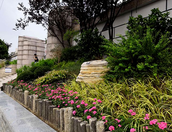 在永清門閘口處,植物特色為“竹隱青松”,以竹子、羅漢松等常綠木本多年生植物為主,營造出綠意盎然的蔥戎景象,整體呼應(yīng)“永青”二字。